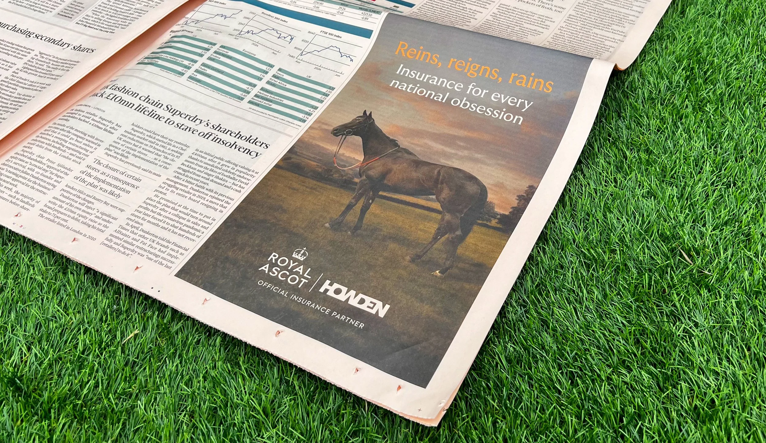 The 2024 Royal Ascot and Howden partnership campaign, "Reins, Reigns, Rains," earned multiple accolades, including a Bronze Drum Award and a Gold World Brand Society Award. Concept, design, and copy by Alistair Fowler.
